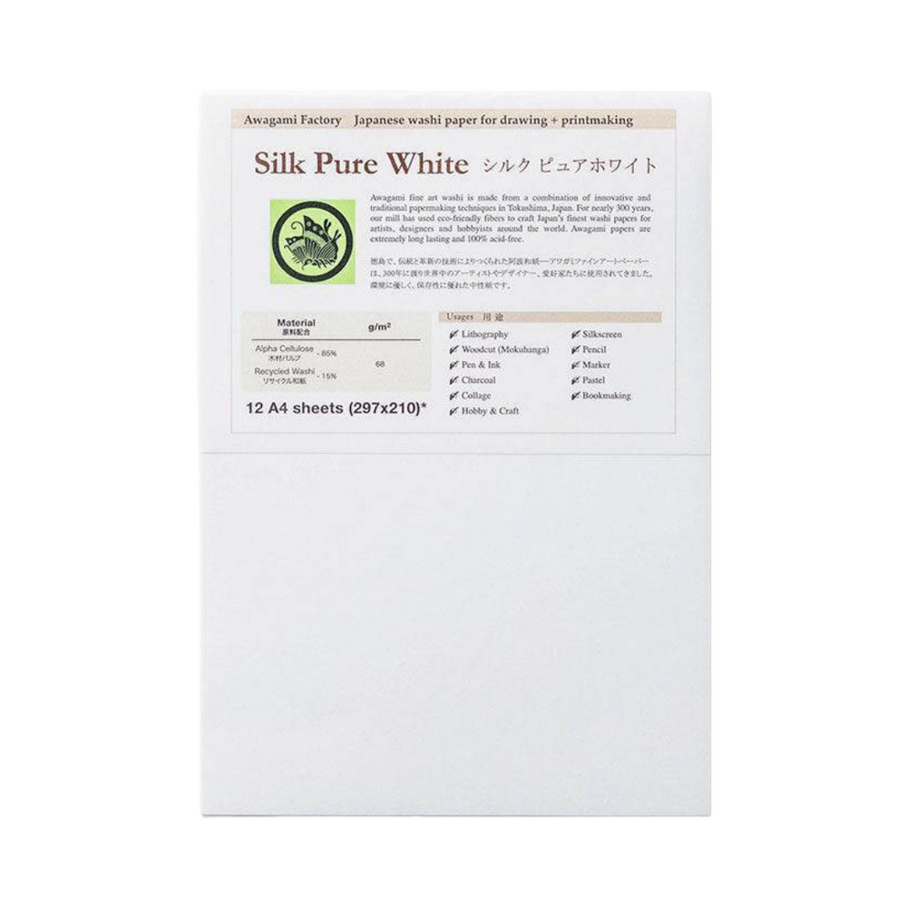 An excellent introductory washi for budget-conscious students, printmakers and designers. Silk Pure White is a warm white / medium weight Japanese paper with 2 distinct surface textures. Both sides may be used to attain different creative effects.