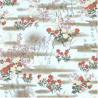 Yusen Chiyogami paper is unique to Japan with most Chiyogami produced with a silkscreen technique. These papers feature intricate patterns and are ideal for collages, picture mats for framing, books, scrapbooking, invitations and more. The pattern CH5618 has small red and white flowers with foliage on a pale blue background with gold accents and kanji script.