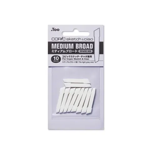 This set of 10 Medium Broad replacement nibs are designed for Copic Sketch and Copic Ciao markers. These broad chisel tip nibs are perfect for filling in large areas and can produce multiple line widths.