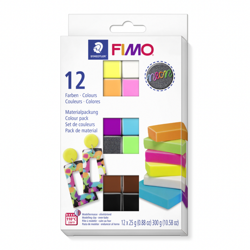 Fimo Soft Polymer Clay is perfect for beginners and hobby artists as it's a soft, smooth clay that's easy to use. Back it in the oven to harden and use if for a range of craft projects like jewellery, accessories and home deco items. This assorted pack of colours includes 12 neon options that can be used as is or mixed together to create even more options. Compatible with FIMO effect, FIMO leather-effect and FIMO professional.