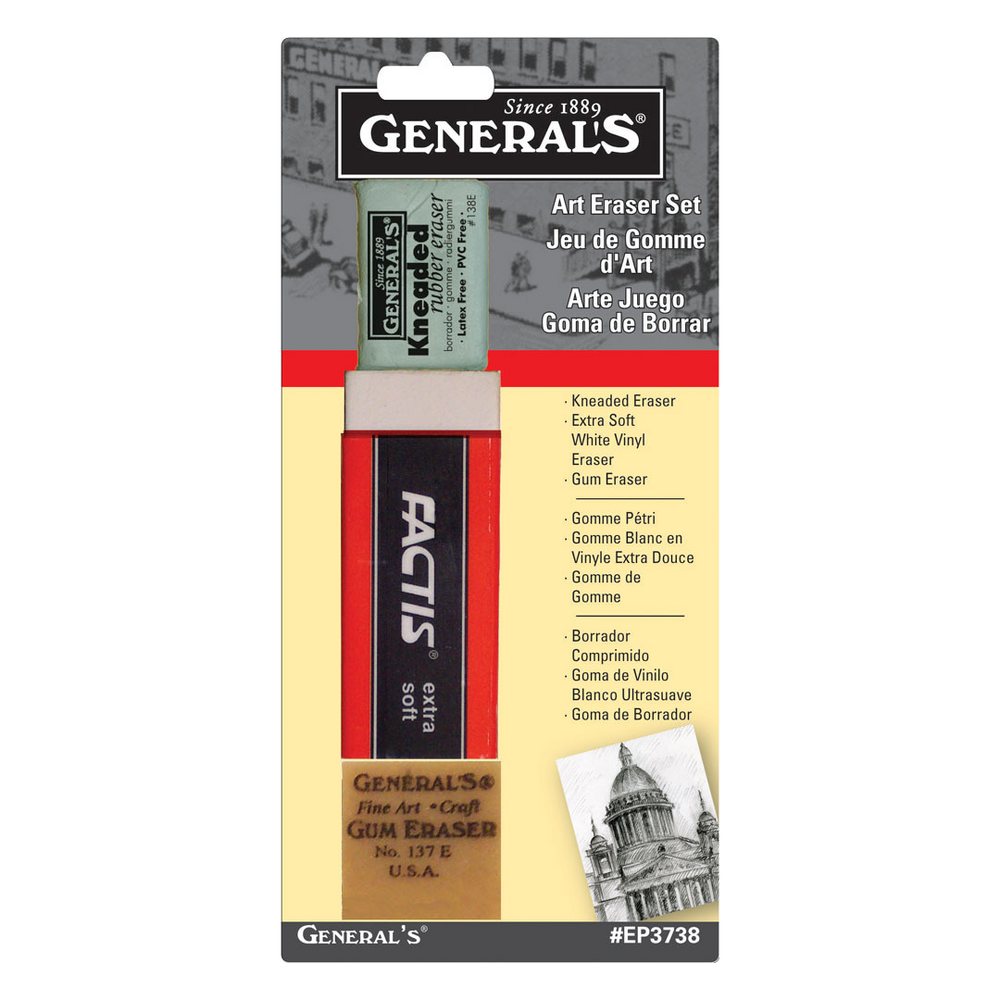 Generals Pencil Co Art Eraser set includes an assortment of different styled erasers all in the one handy pack. It's perfect for artists looking to try a variety of erasers or makes a great gift for the artist in your life. It also works well for beginners who might want to try a variety of erasers on various mediums.