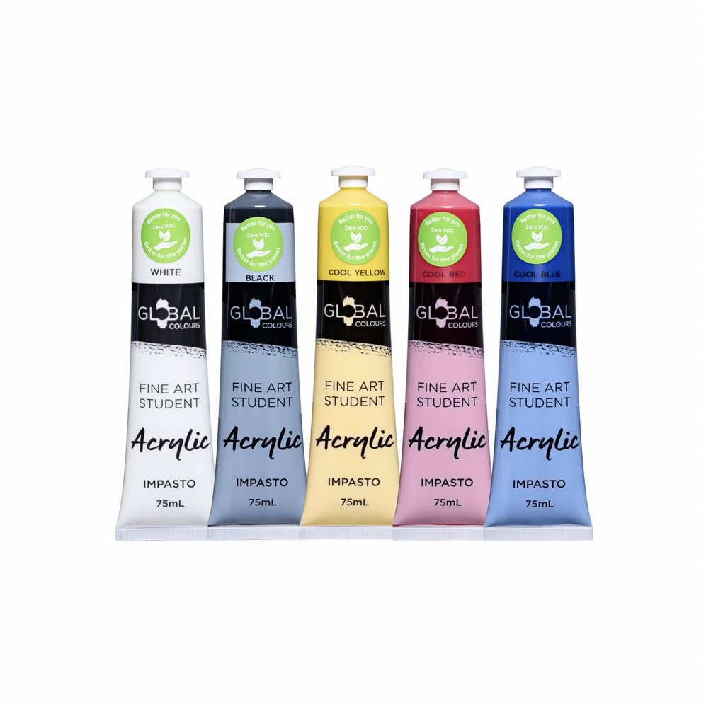 With Global Colours Fine Art Student Acrylic Impasto you are only limited by your imagination. These brilliant pigments are ideal for bold structured techniques such as simulated oil painting through to delicate watercolours.