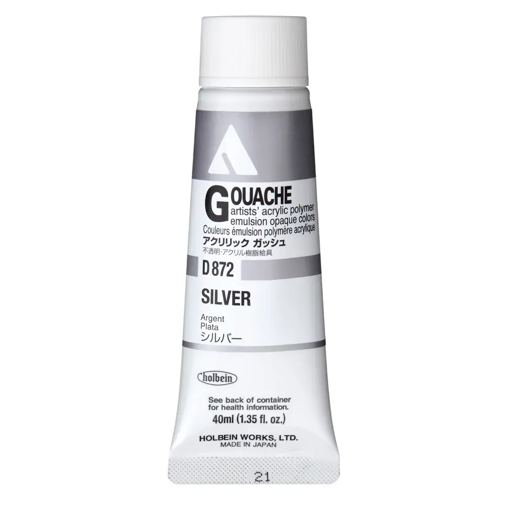 Holbein Acrylic (Acryla) Gouache Silver moves, reacts, blends and feels like traditional gum arabic gouache but the difference is that Holbein Acrylic Gouache is water resistant when dry.  Acrylic Gouache dries to a beautiful, velvet matte finish and is incredibly opaque.