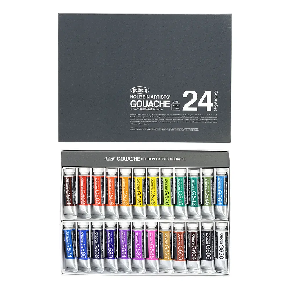 Set 24 includes an assorted selection of colours in a larger 15ml sized tube making it the perfect option for artists wanting to expand their colour range from the traditional 12 colour palettes. Holbein Artist's Gouache is an opaque watercolour paint that's suitable for use by professional artists, students and designers. Try this wonderful set today!