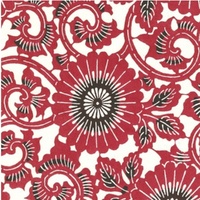 Katazome KA012 features a red and black toned floral pattern made up of geometric shapes in the background. Katazome is a traditional Japanese stencil dyeing technique. It is a paste-resist process that is used to dye both cloth and papers. Traditional designs feature many seasonal themes and colour found in Japan, as well as native creature and fauna. Designs include Bamboo, ibis, cherry blossoms, parasols and fans.