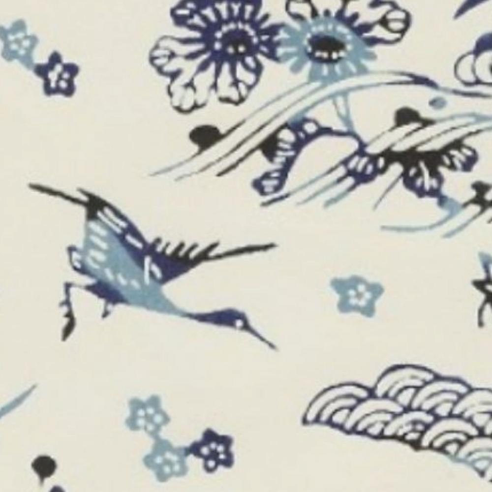 Katazome KA181 features a delicate pattern of blue crames in flight amongst florals on a creamy background. Katazome is a traditional Japanese stencil dyeing technique. It is a paste-resist process that is used to dye both cloth and papers. Traditional designs feature many seasonal themes and colour found in Japan, as well as native creature and fauna. Designs include Bamboo, ibis, cherry blossoms, parasols and fans.
