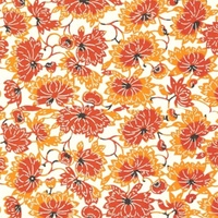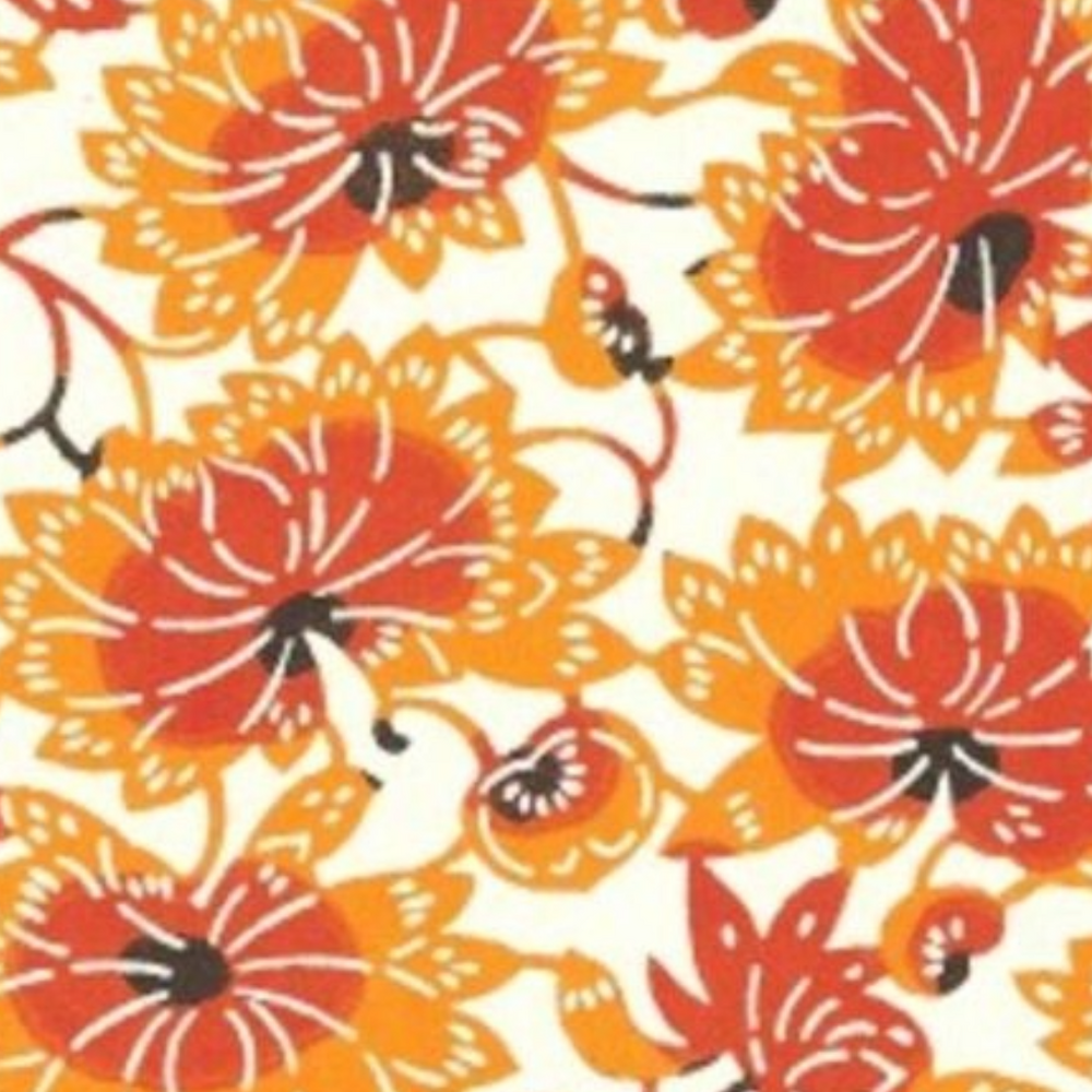 Katazome KA193 features pretty orange and yellow flowers in an open style with various shades on a cream background. Katazome is a traditional Japanese stencil dyeing technique. It is a paste-resist process that is used to dye both cloth and papers. Traditional designs feature many seasonal themes and colour found in Japan, as well as native creature and fauna. Designs include Bamboo, ibis, cherry blossoms, parasols and fans.