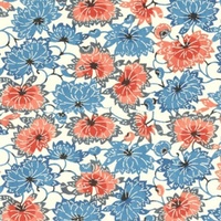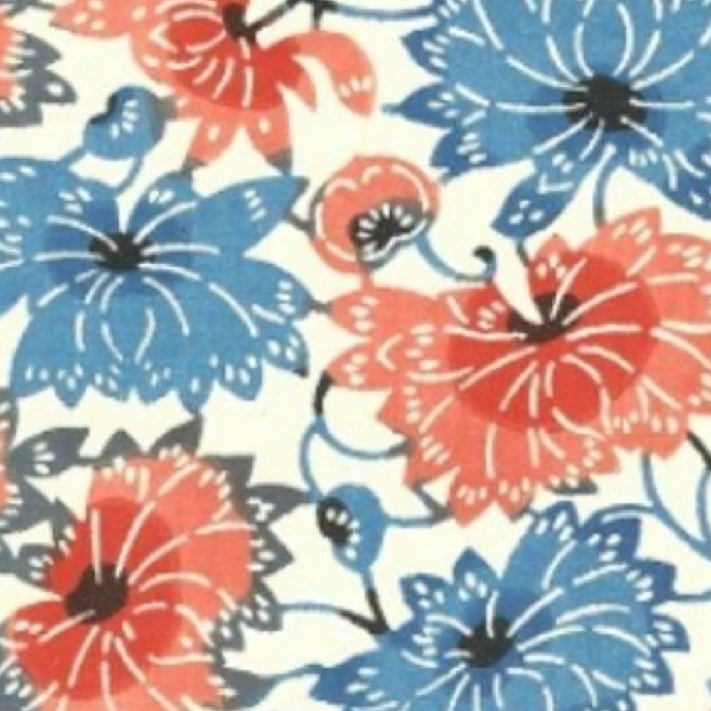 Katazome KA194 features pretty pink, red and blue flowers in an open style with various shades on a cream background. Katazome is a traditional Japanese stencil dyeing technique. It is a paste-resist process that is used to dye both cloth and papers. Traditional designs feature many seasonal themes and colour found in Japan, as well as native creature and fauna. Designs include Bamboo, ibis, cherry blossoms, parasols and fans.