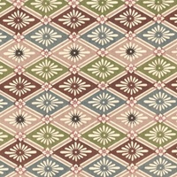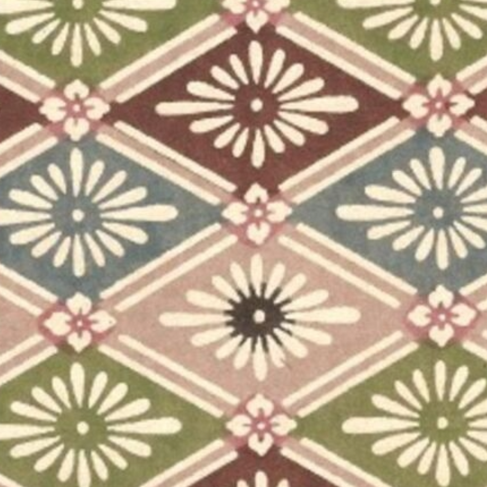 Katazome KA222 features multi coloured floral design on a background of geometric diamond shapes. Katazome is a traditional Japanese stencil dyeing technique. It is a paste-resist process that is used to dye both cloth and papers. Traditional designs feature many seasonal themes and colour found in Japan, as well as native creature and fauna. Designs include Bamboo, ibis, cherry blossoms, parasols and fans.
