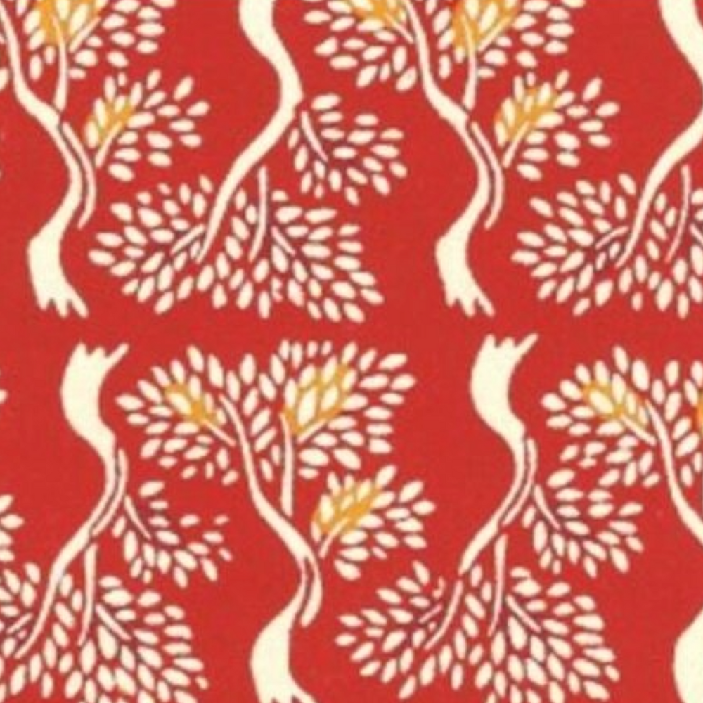Katazome KA244 features white trees with yellow blossoms on a vibrant red background. Katazome is a traditional Japanese stencil dyeing technique. It is a paste-resist process that is used to dye both cloth and papers. Traditional designs feature many seasonal themes and colour found in Japan, as well as native creature and fauna. Designs include Bamboo, ibis, cherry blossoms, parasols and fans.