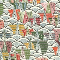 Katazome KA313 features multicoloured ships on a swirling river . Katazome is a traditional Japanese stencil dyeing technique. It is a paste-resist process that is used to dye both cloth and papers. Traditional designs feature many seasonal themes and colour found in Japan, as well as native creature and fauna. Designs include Bamboo, ibis, cherry blossoms, parasols and fans.