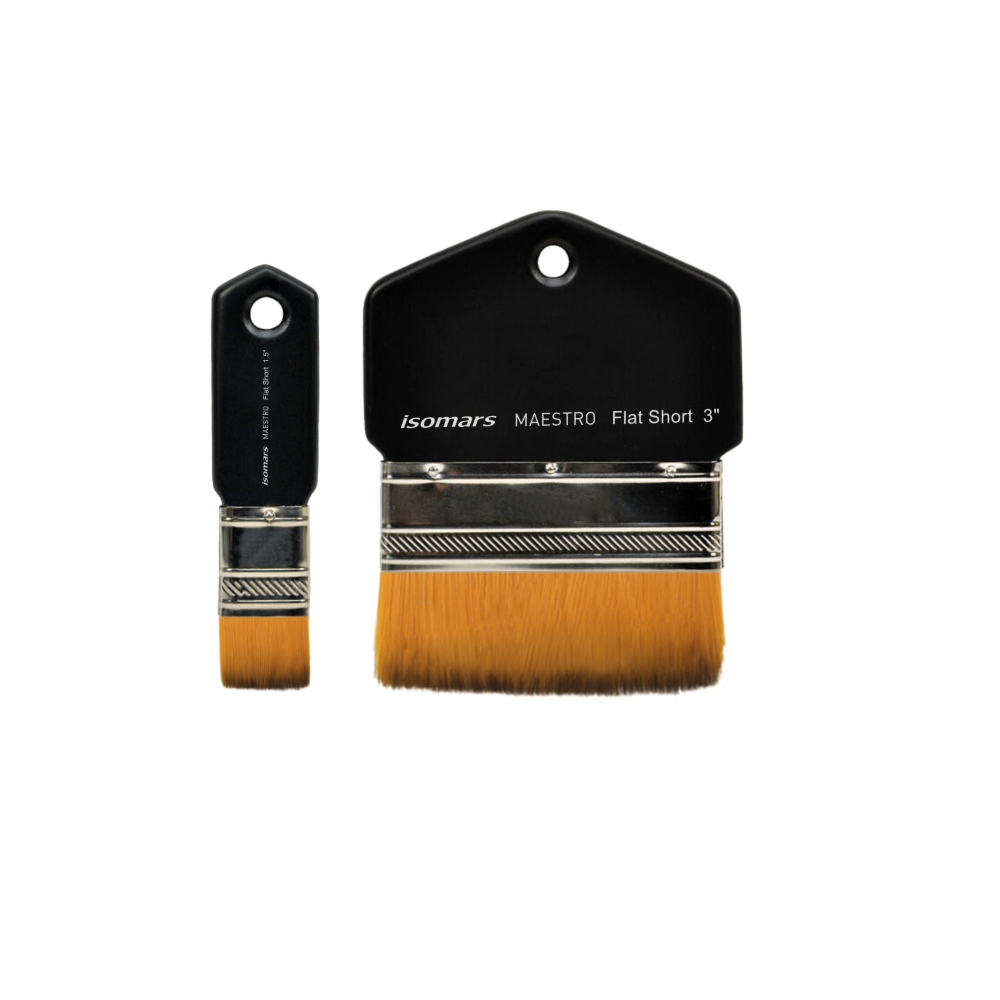 The Isomars Maestro Taklon Flat Short Handle Brush Set is perfect for artists of all skill levels and works with a variety of wet media including acrylics, watercolours, gouache, poster paint and more. In a large 1.5" and 3" wide flat shape these brushes are great for painting large areas like backgrounds, or for washes on canvas and paper.