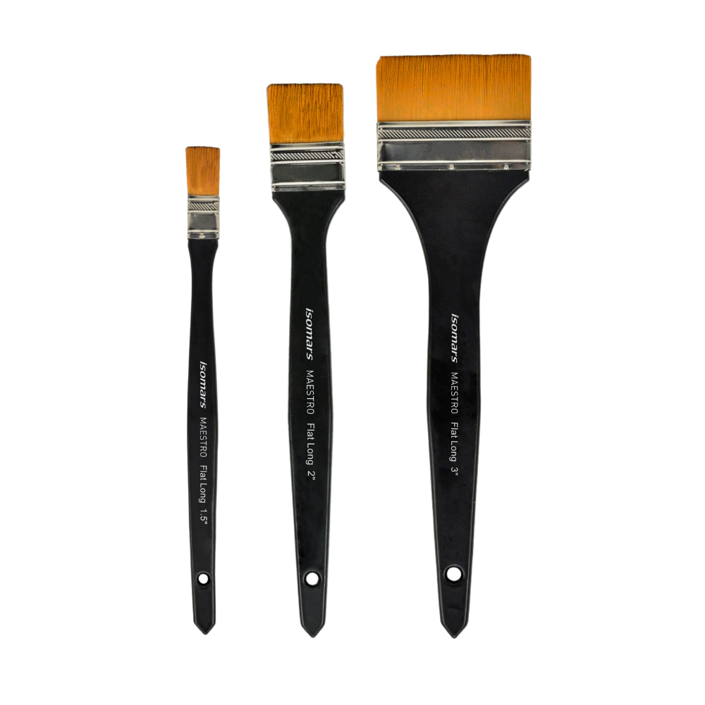 The Isomars Maestro Taklon Flat Long Handle Brush Set is perfect for artists of all skill levels and works with a variety of wet media including acrylics, watercolours, gouache, poster paint and more. In a large 1.5", 2" and 3" wide flat shape these brush is great for painting large areas like backgrounds, or for washes on canvas and paper.