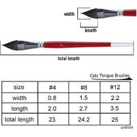 Cat's Tongue brushes come in Sizes: #4, #8, #12, its unique point provides a good range of brush strokes and techniques. Use with watercolour, gouache, illustration, animation and renderingor other supports for fine art