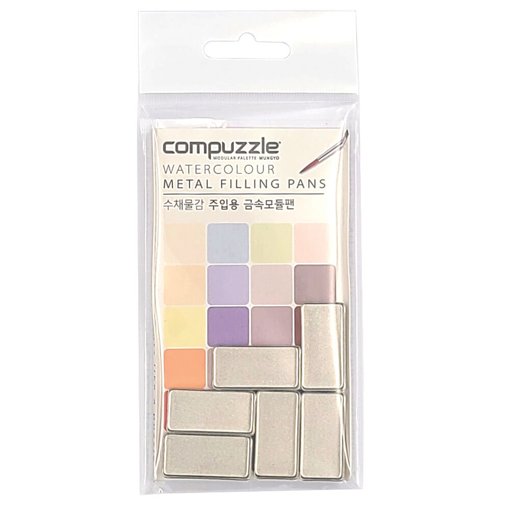 Mungyo Compuzzle Filling Pan's are a premium metal filling pans that are designed to fit securely within the Compuzzle palette system. These pans are refillable, magnetic and easily arranged which gives you full control on your palette set up and colour options. These small pans are available in a pack of 12 and they're the perfect size for artists who paint a variety of subjects as the small size means you can fit even more colours into your palette. Use with water-based mediums like watercolour and gouache. Mix, match and expand your palette as needed with the Mungyo Compuzzle Palette system.