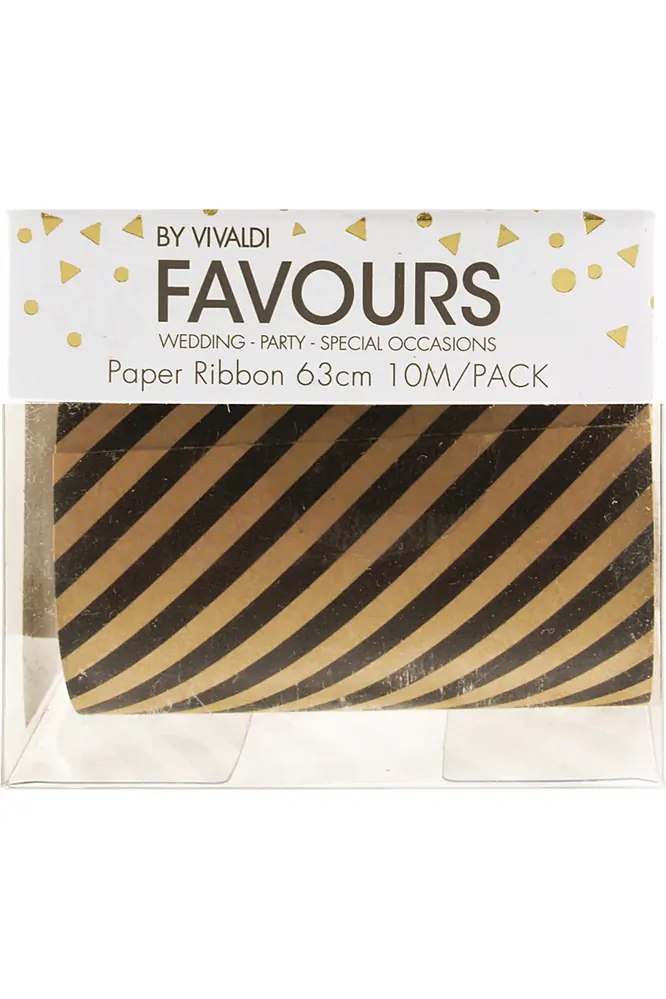 This paper ribbon roll is perfect for wrapping or crafting. It features a striking black diagonal design and measures approx. 6cm in width and has 10m of length. It can be used alone as a feature point or with other sateen or mesh based ribbons for a striking effect.