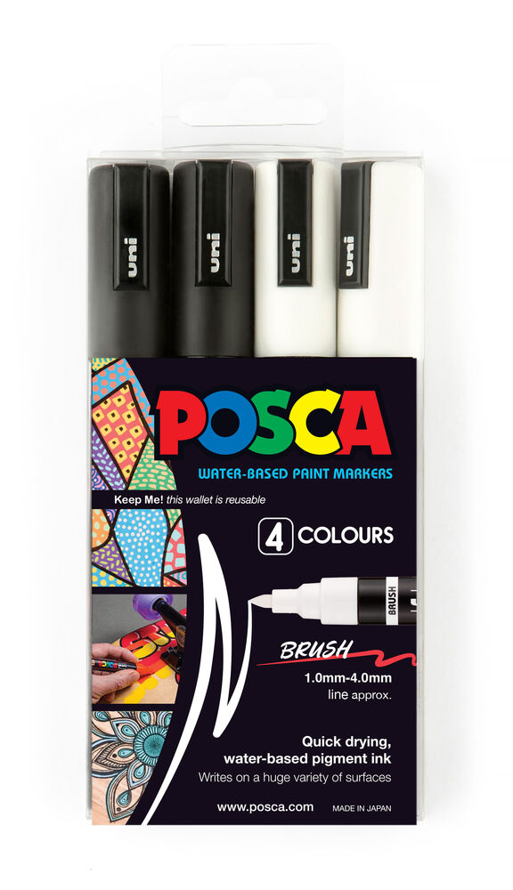 Posca Paint Marker PC5BR Brush Tip Set 4 Black White