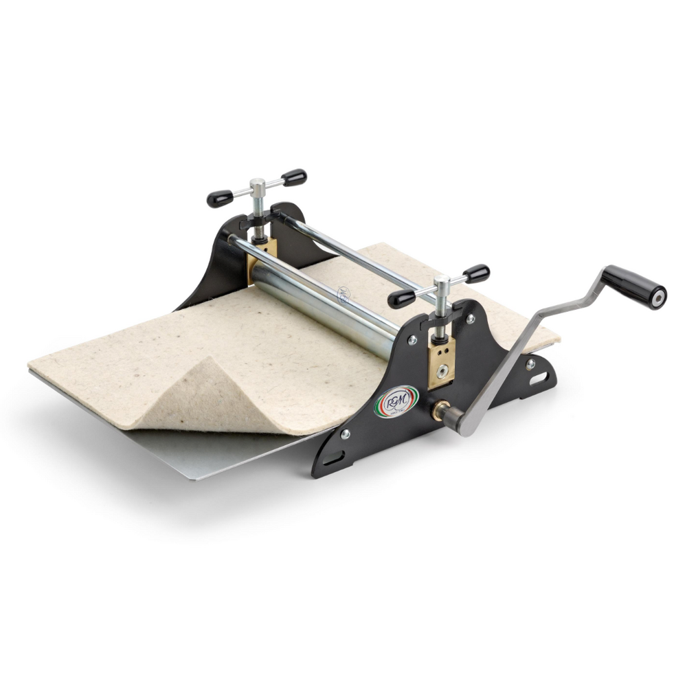 The RGM Manual Etching Press 2642 is suitable for chalcographic printing and engraving and the precision of hte mechanical parts makes this etching press a preofessional option for artists. It features a steel structure with lower drag knurled roller and smooth upper roller, galvanized iron tabletop of 3mm  3mm felt blanket and a printing size of 26.5x42cm. This manual press has a drive system provided by a 3 spoke crank handle. 28cm race length. 27 x 42 x 0.3cm galvanised iron press bed with a 16kg press weight.