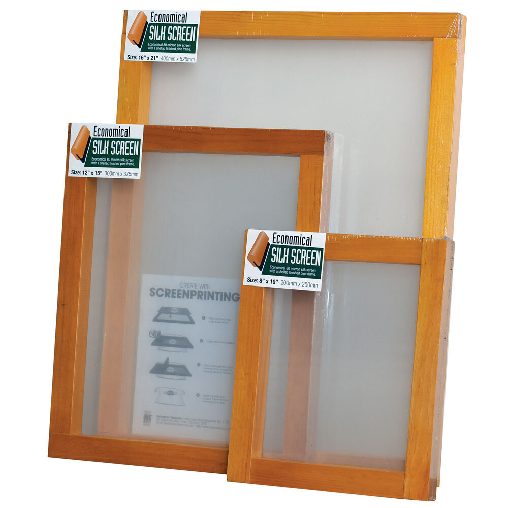 Economy silk screens made from pine and with a shellac finish. 43T Amber Mesh. Only While Stocks Last