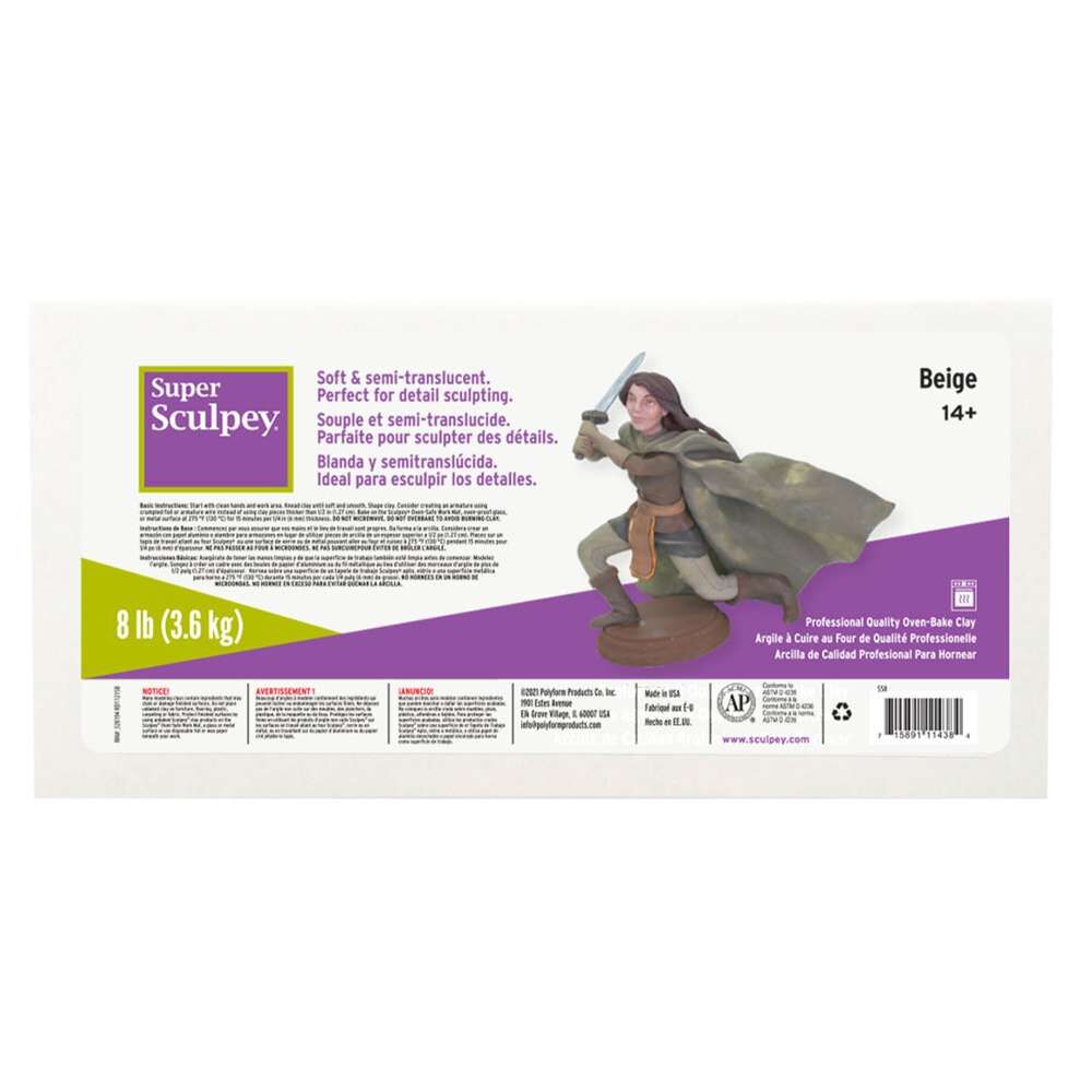 Super Sculpey Clay is a popular choice for artists and designers. With it's ceramic like finish it's easy to work with and can be oven baked. With a semi-translucent, beige pink colour it's an excellent oven bake clay for making a range of fine detailed sculptures or prototypes. It can be sanded, carve and drilled once baked and is shatter resistant and chip resistant. Super Sculpey Original Clay is a great option for artists of all skill levels and the 3.6kg size is perfect for workshops or classroom use.
