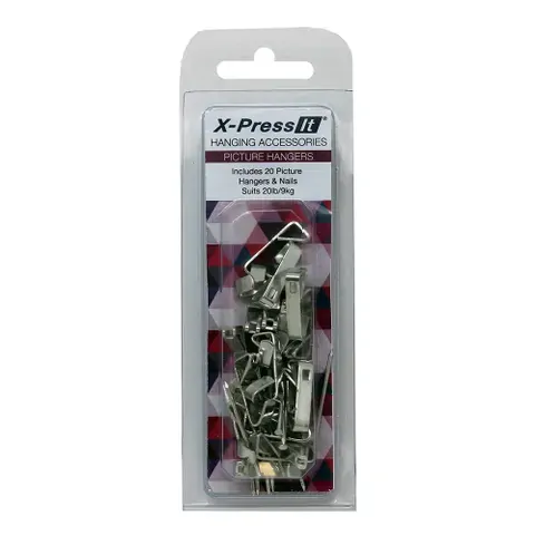 Xpress It Picture Hangers can be used for hanging objects and frames on timber studded walls. This set includes 20 picture hangers and nails and each hanger hods up to 20lb or 9kgs.