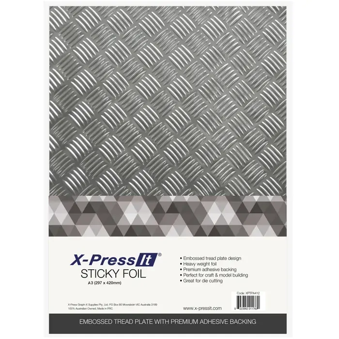 X-Press It Sticky Foil Tread Plate is a durable foil with a tread plate design perfect for craft & model building. It has a metallic silver embossed design showing a tread plate and it's sticky foil back means it can be stuck onto most surfaces. Use Xpress It Sticky Foil Tread Plate to give an industrial look toy our next craft or model making project. Suitable for use in the home, classroom or studio.